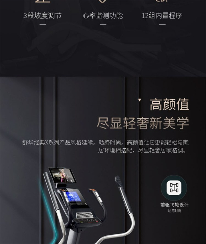 舒华家用椭圆机SH-B6500E采用电磁控系统,设有24段阻力等级,手握心律片侦测心率,7kg磁控轮。