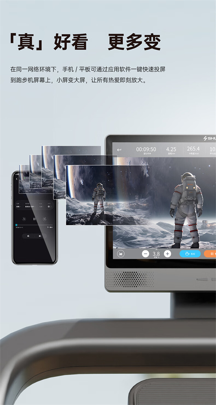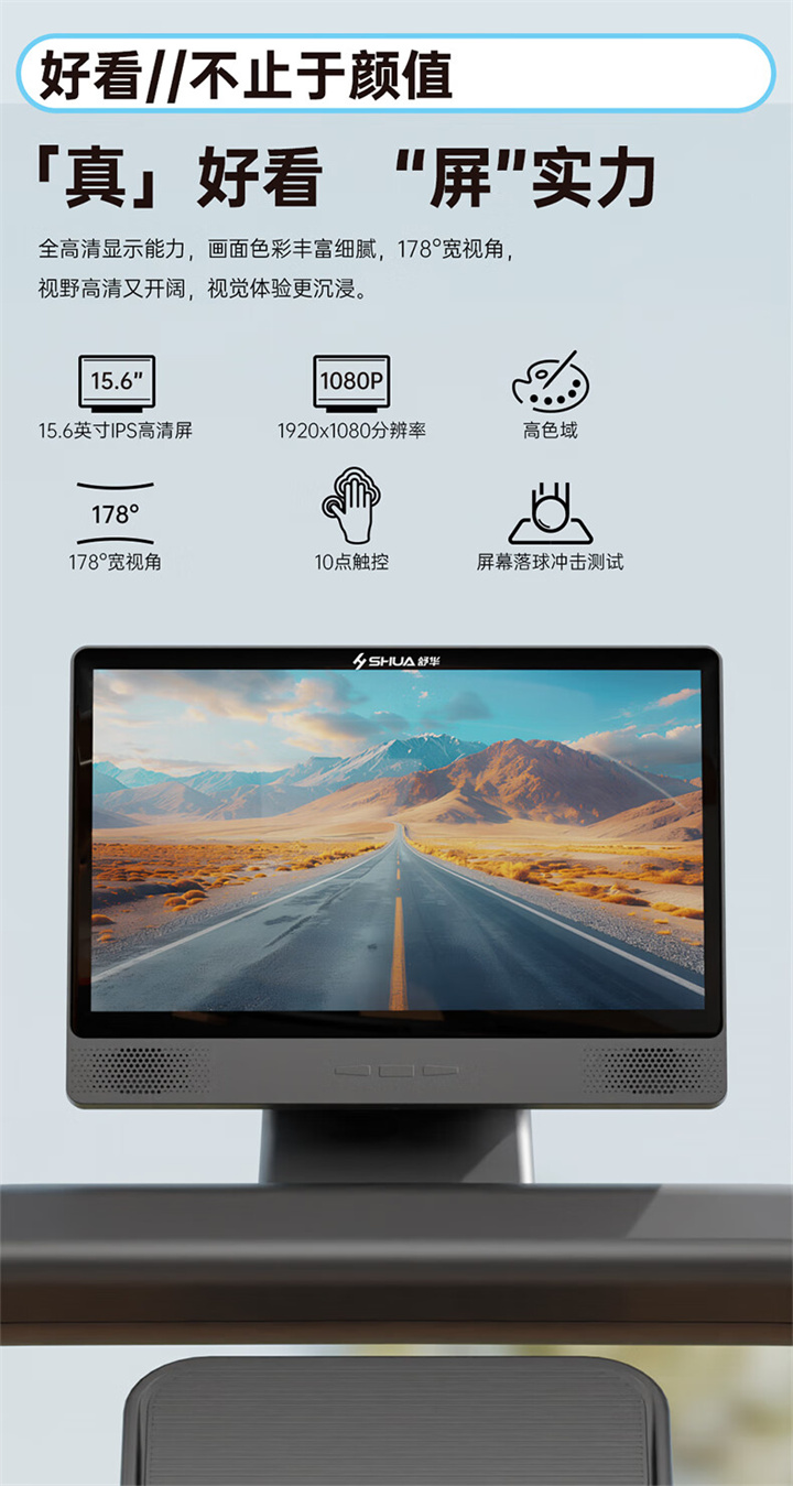 球速体育推荐健身器材-舒华商用电动跑步机SH-T6500拥有10.1寸IPS高清触摸屏、Z型动感时尚外观设计、70×150mm精钢立柱机身、F级高效静音马达、520mm商用豪华跑带和35mm双层全跑台减震跑板等优势,让您享受科学跑步。